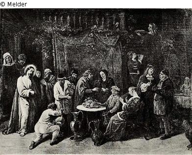 Links steht Christus, von vier Personen umgeben, vor ihm ein Diener mit Weinkrug. Rechts Gäste und ein flötenspielender Knabe, eine Magd mit Kuchen, etwa dreißig Personen. Goldener Rahmen.