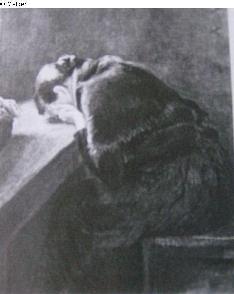 Die Näherin. Frau mit graubraunem Schultertuch und dunkelgrünem Rock sitzt an einem Tisch, ihr Gesicht in den Händen vergraben. Links ein Korb mit Weißzeug. Links unten am Tisch bezeichnet: F.v.Uhde.; gerahmt
