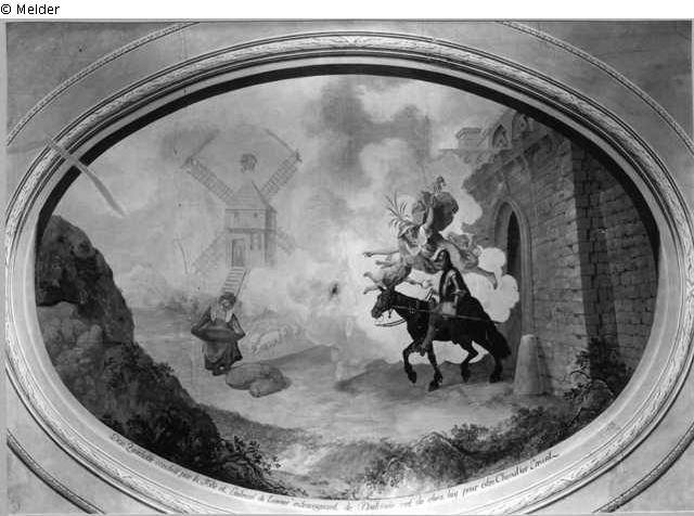 Deckenbild. Thematisch auf die 1796/1797 hier platzierten Teppiche aus der Don Quichotte- Serie der Pariser Gobelins. Putz.