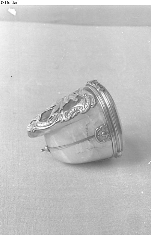 In Gestalt eines Grenadierhelms aus hinten weißem, vorne lila Amethyst. Deckel aus dem gleichen Stein. Fassung, Spangen und Beschlag der Vorderseite des Helms aus Gold. Beschlag: Trophäen von Rocaillen umgeben. An der Ringfassung des Deckels vorn goldene Zweige mit Diamanten und Rubinen besetzt. Marke: Auf Deckelstulp zweimal Krabbenmarke R.5906 im Oval (Einfuhrstempel Frankreich, 1838 - 1864)