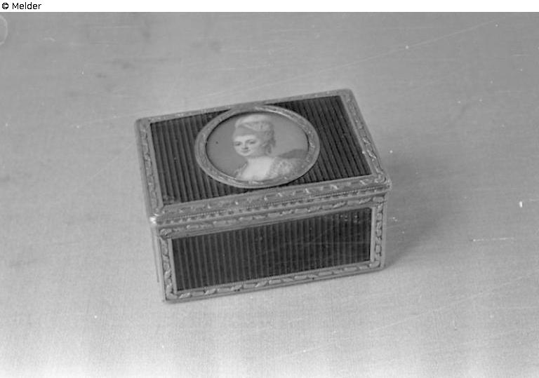 Rechteckig, Klappdeckel. Gold, an den Kanten profilierte und ornamentierte Leisten aus zweifarbigem Gold. Flächen durchsichtig grünes Email über guillochiertem Grund. Auf Deckel in ovalem Goldrähmchen Bildnisminiatur einer jungen Dame im rosa Kleid, Straußenfeder und rosa Schal im Haar. Auf Elfenbein unter Glas, nicht signiert. Innen glatt Gold. Marke: Auf Boden, Deckel Stulp Jb. E (gekrönt) Paris, 1768 - 1769, R.6426, Pächterz. R.6524, Julien Alaterre, 1768 - 1774, Mrz. LR. R.6714, Louis Roucel, Mr. 1763 - 1779, auf Stulp graviert: Roucel Orf'e du Roi A Paris