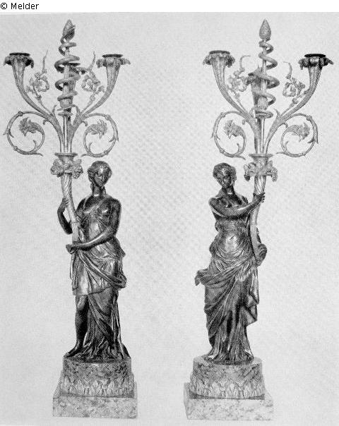 Dreiarmig. Auf rundem Marmorsockel eine schwarz patinierte antike Frauengestalt in lose drapierter Gewandung, die mit beiden Händen ein Füllhorn hält. Diesem entsteigen drei Hörner aus Goldbronze als Kerzenarme stilisierte Blütenzweige und ein Tyrsosstab.
