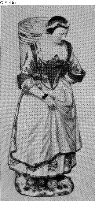 sie mit Bütte auf dem Rücken, Er mit Henkelkorb, in beiden Behältern Blumenlöcher. Bunt bemalt: Großgeblümtes Miederkleid, gelbe Schürze, schwarze Haube - seegrüne Hose, violetter, goldgeblümter Rock, apfelgrüner Krempenhut, schwarze Schaftstiefel. Blumenbelegte Sockel. Modell von Kändler.