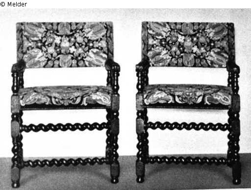 Ein Paar kleine holländische Armlehnsessel, sogenannte Rubensstühle. Nußholz gedrechselt. Westfälische, außerordentlich fein in Wolle gewirkte Tapisseriebezüge: Auf schwarzem Grund farbiges Blüten- und Früchtewerk, das auf dem Sitz behelmtes Doppelwappen umschließt. Eingewirkt Inschriften: "E.S.V.P./Spiegell. Münchhausen." Die Gestelle Holland. Die Bezüge hergestellt in der Wolfenbüttler Wirkerei des Meisters Boldwyn aus Brüssel.
