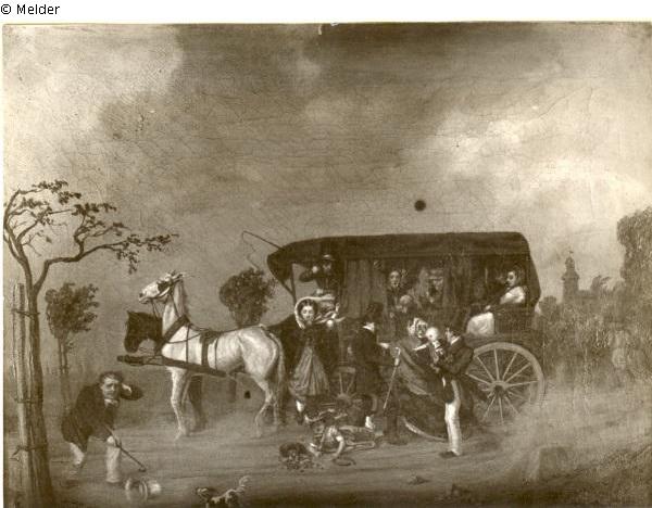 bei heraufziehenden Sturm und düsterem Himmel hält ein Kremser mit Ausflüglern. Eine Mutter deren Kind anscheinend herausgefallen ist, steigt gerade an dem Kutschersitz; ein Herr mit Zylinder hilft einer Dame einzusteigen, ein anderer mit rotem Regenschirm unter dem Arm hält ein Kind. Links im Bild ein Herr dem der hellgraue Zylinder fortfliegt. Im Hintergrund die Kirche (von Tempelhof?) Sign. unten rechts: Arnold Neumann 1856 Neuerwerbungen des Märkisches Museum. Kulturgeschichtliche und stadtgeschichtliche Erwerbungen Herbst 1937 bis Weihnachten 1938 XI, Berlin 1939, S. 35, Abb. 23