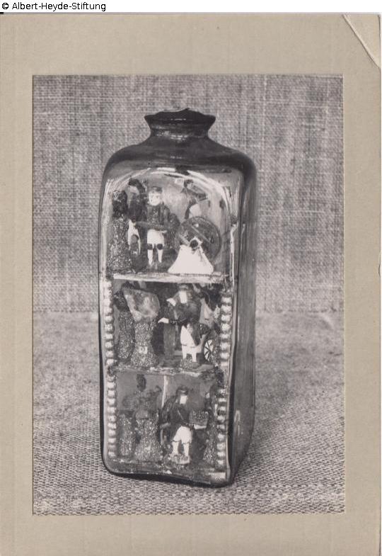 Vierkantige Flasche auf farblosem Glas mit darin aufgebauter plastischer Darstellung eines Bergwerkes, Mündungsrand ausgestellt über Einschnürung, verschlossen mit einem geschnitzten Holzkorken. In drei Ebenen aus einem hölzernen Gerüst aus vier Eckpfeilern sind geschnitzte, bemalte Figuren und Gegenstände angeordnet. Unten ist modellhaft der Abbau von Erzen (die Sohlen sind scheinbar beschichtet mit glitzerndem Flittergold, Pyrit oder Bleiglanz beschichtet) dargestellt, darüber neben dem Abbau auch das Zerkleinern und Abfüllen des Gesteins in Grubenwagen und oben das handbetriebene Förderrad, die sogenannte Haspel. Die Bergleute tragen schwarze Jacken zu weißen Hosen mit dunklen Kappen.
