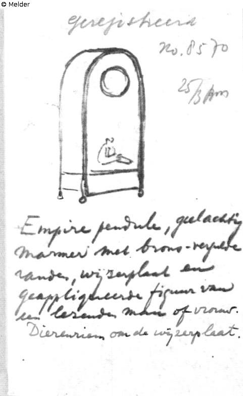 Quelle: Algemeen Politieblad van het Koninkrijk der Nederlanden, Jg. 95, Nr. 34, 30. November 1946 publizierten Liste 719 „Te ‘s-Gravenhage ontvreemd in 1943/1944, hollandsche teekeningen, t. w.“; Intern Aangifte Formulier vom 25.3.1946, BArch Koblenz B 323/2 fol. 166 mit eigenhändiger Skizze von F. Lugt;