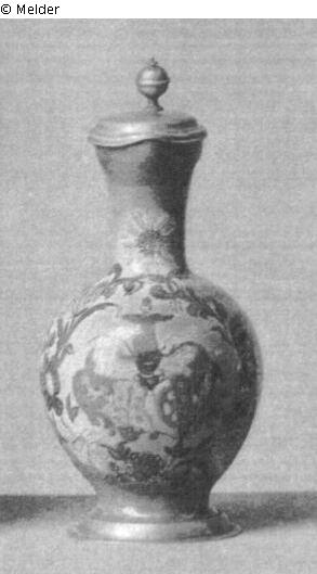 Suchmeldung | Einzelobjekt Enghalskrug Lost Art-ID240008 Vorherige Weiter TitelEnghalskrug Datierung1701/1725 Zeitraum1500-1900ObjektartGefäßObjektgruppeKunsthandwerk / -gewerbeMaterial / TechnikKeramik ; Glasur (Fayence) Höhe 24,50 cm Beschreibung grau glasiert,- bemalt mit Gelb, Weiß, Mangan und verbranntem Rot mit Allianzwappen in Blumenkranz,- Fußreif und Deckel aus Zinn,- Nürnberg, 1. Viertel 18. Jahrhundert,- oberer Rand und Henkel repariert. Weiterlesen Weniger anzeigen Veröffentlicht seit2001 Kontakt Kontaktanfragen richten Sie bitte an das Deutsche Zentrum Kulturgutverluste.