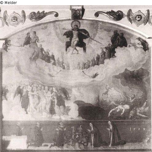 Darstellung des Jüngsten Gerichts mit Stifterfamilie; Monogramm: F.(E.?) B.; Teil eines Epitaphs für Melchior Elerdts aus dem Jahr 1557;