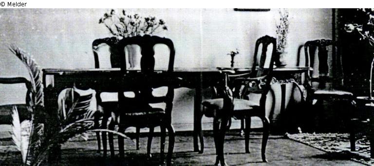 WGA: "1 Stuhl moderne Kopie; […] der Bueffetschrank war ein kleiner, seltener Frankfurter Schrank um 1700, ca. 170x100 cm, Hellbraun, Nußbaum, gekehlt) und die zwei 'Abstelltische' […] 2 sudeutsche Konsolen."