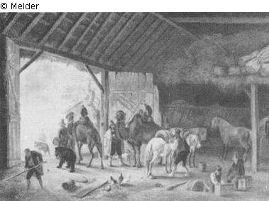 WV 411. Eine bunte Gesellschaft, sechs Mann und zwei Jungen mit zwei Bären, zwei Kamlen, drei Affen in roten Jacken, Pferd und Esel verlassen eine Scheune, in der sie genächtigt haben