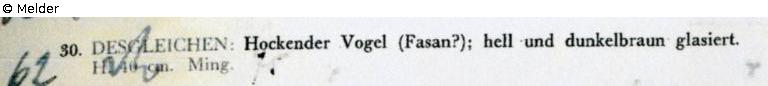 Sammlung Eduard Fuchs, wahrscheinlich erworben nach 1924 und in dessen Besitz bis 1933; 25.10.1933 Beschlagnahmung durch die Gestapo; zwangsweiser Verkauf (Zahlung Reichsfluchtsteuer) durch seine Tochter Gertraud Fuchs: Versteigerung Auktionshaus Rudolph Lepke Berlin, Katalog 2115, S. 7 - am 15.10 und am 16.10.1937 wurde dieser Dachreiter unter Nr. 30 versteigert: „FAYENCE-DACHREITER: Hockender Vogel (Fasan ?); hell- und dunkelbraun glasiert. Höhe 40 cm. Ming“.