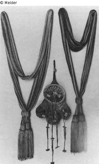 Feldbinden - Die lange, schmale Feldbinde hat rote (elf) und weiße Längsstreifen. An den Enden ist jeweils eine Quaste mit langen roten und weißen Kordeln befestigt. Das Geflecht des die Feldbinde zusammenhaltenden, wulstigen Ringes sowie die Bünde der Quasten bildet ein vertikal verlaufendes rot-weíßes Zackenmuster. die Feldbinde ist z.T. zerschlissen. Bez. mit »K.Z. 56«.