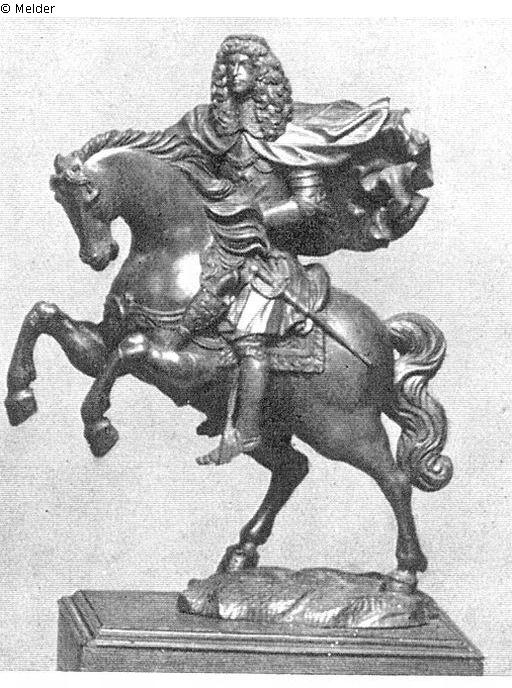 Buchsstatuette: Feldherr zu Pferde, im Zeitkostüm mit wehendem Mantel, Lorbeerkranz im Haar, auf einem stehenden Pferd