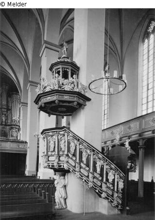 Verlustgeschichte: Im Februar 1945 wurde die vom Magdeburger Bildhauer Tobias Wilhelmi geschaffene Kanzel der Johanniskirche zum Schutz vor Kriegseinwirkungen ausgelagert. Im Auftrag der Gemeinde führte die Magdeburger Firma Hermann Habs die Demontage und den Transport durch. 51 Kisten mit den Skulpturen und dem Dekor der Kanzel sollten in den von der Rüstungsindustrie genutzten unterirdischen Anlagen in Halberstadt-Spiegelsberge aufbewahrt werden.