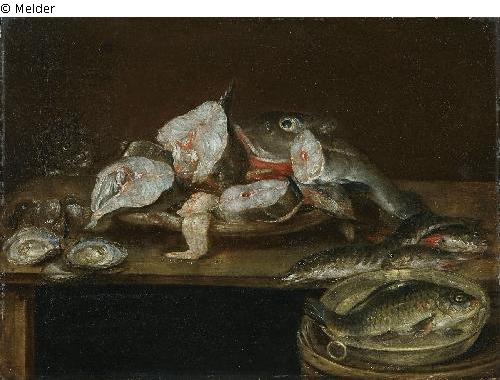 Fischstillleben. Schellfisch, Barsch, Hecht, Austern und Katze. Bild signiert. Andere Maße im Lempertz-Katalog 1937: 41,3 * 56,7 cm.