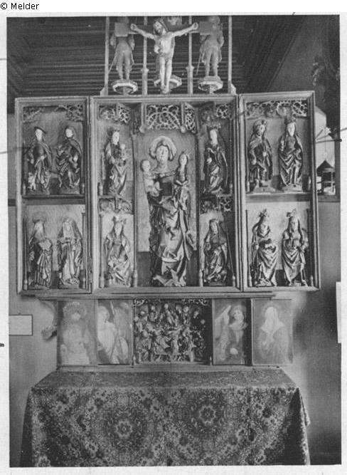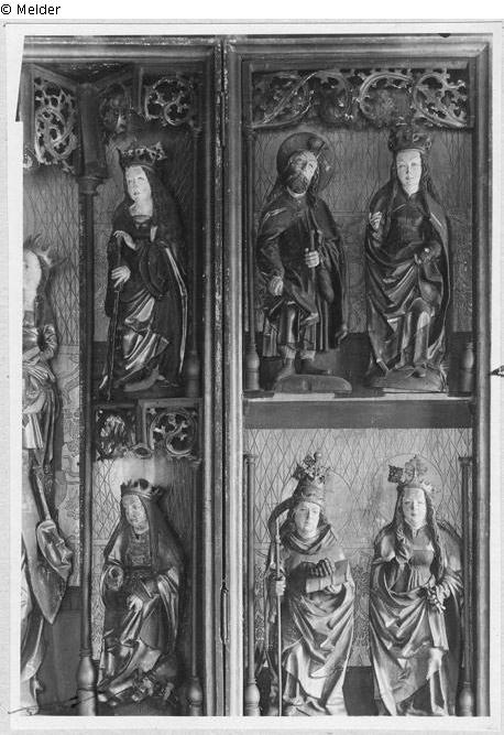 Es fehlen die rechten Nebenfiguren vom Schrein: Hl. Katharina (rechts oben), Hl. Margaretha mit dem Drachen (rechts unten) und alle 8 Heiligenfiguren der Flügel (Martin, Elisabeth, Antonius, Nonne, Jakobus, Ursula, Urban, Apollonia)