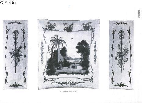 Die drei größeren zeigen in farbiger Malerei auf gelblich-weißem Grund chinesische Landschaften mit Figuren, umrahmt von gebrochenen Stäben, goldfarbigen Rocaillen und Blumen, die vier schmaleren Gehänge von Jagd- und Gartengeräten an blauen Bändern, umrahmt von goldfarbigen Rocaillen.