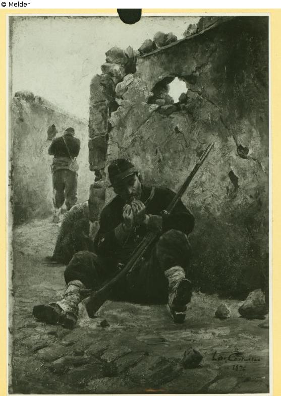 Tafelmalerei: Bild: Soldat ohne Dienstgrad & Stadtmauern & Brustwehr, Zinnen (befestigte Stadt) & Schußwaffen: Gewehr & Erholung (der dienstfreie Soldat)