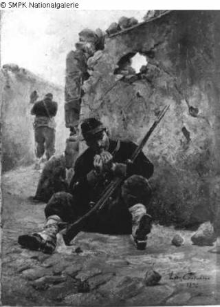 Französische Infanteriesoldaten zwischen Mauern mit improvisierten Schießscharten