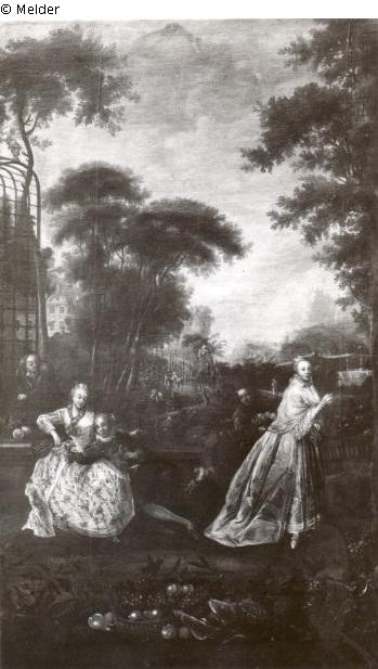 Vorn links ein Liebespaar, rechts eine Dame und ein Knabe mit Früchten, im Hintergrund Amorettentanz, Festzug nach einer Felsenstadt ; Blauer Führer, Saal 45, S. 53
