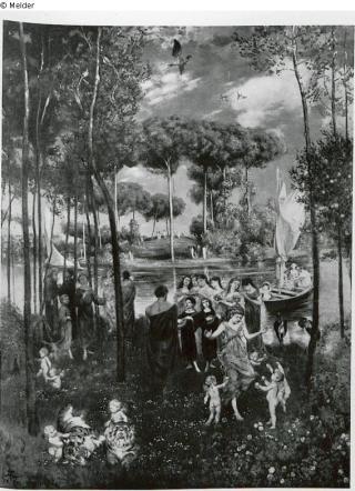 Arkadische Wiesenlandschaft mit Flußlauf, in der sich junge, antikisch gewandte Menschen musizierend unter hohen Pinienbäumen ergehen. Tiefblauer Wolkenhimmel. signiert l. u.: H. Th. 1879