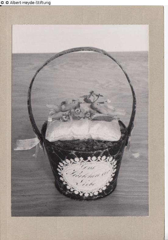 Bügelkörbchen, darin ein auf Moos gebettetes Kissen mit Kunstblumen dazwischen zwei unbekleidete Wachspuppen. Auf der Vorderseite Zier-Etikett mit Widmung: „Das Körbchen der Liebe“.