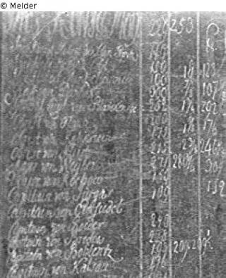 Tafel aus Kiefernholz mit zwei Randleisten aus Eichenholz. Mit schwarzer Ölfarbe gestrichen, obere Randleiste weiß. Nach dem König enthält die Tafel die Namen und die Gewichtsangaben für seine Kinder und für namentlich erwähnte Offiziere für den Zeitraum vom 3. Oktober 1727 bis zum Januar 1731. Die Angaben sind mit weißer Ölfarbe angezeigt. Tafelfläche: 77 cm breit