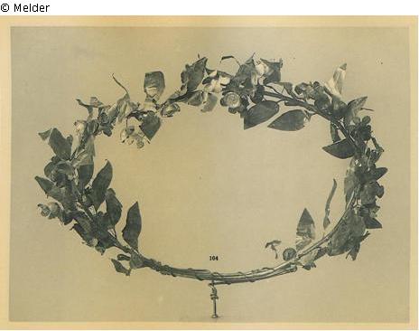 SNK: Verkäufe Reichskommissariat, Referat Sonderfragen Dr. E. Göpel. [...] Goldkranz. Griechisch, 4. Jh. v. Chr., Durchmesser 17 cm. Ex coll.: Baurat Schiller, Cat. 104, tab. 41; Foto Archief SNK 161 [handschriftliche Marginalie]; SNK 285: Ausgewählt (?) vom Museum Dresden, Prof. Posse, und # von Dr. Göpel (Prof. Posse war mittlerweile verstorben)#kranz, Gold, griechisch, 4 Jh. v.Z.