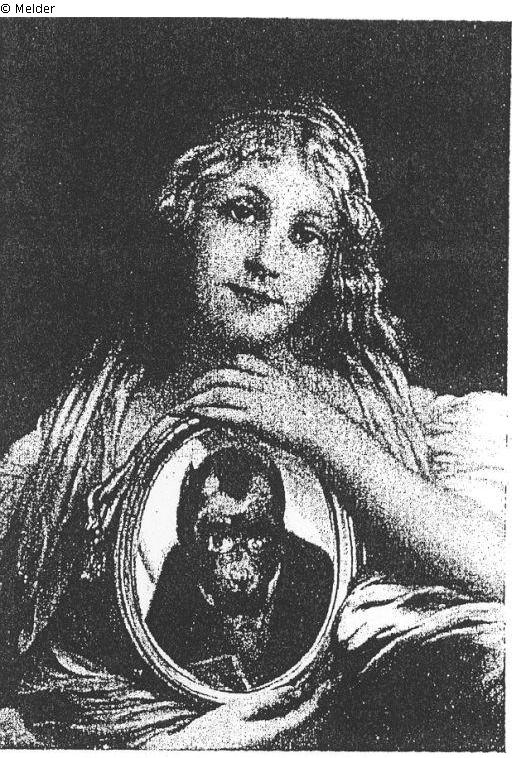 ein junges blondes Mädchen in einem rosa Kleid hält einen ovalen Goldrahmen mit einem Affenbildnis; signiert