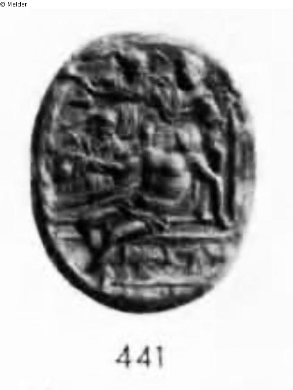 Bange-WV, Nr.: 441 (Α. N. 746. Inv. 2317.) Titel: Grablegung Christi. Der Leichnam wird von einem bärtigen Mann in den Sarkophag gelegt. Links Maria, Christi Arm haltend; weiter zurück Magdalena, die mit gebreiteten Armen schmerzerfüllt herbeieilt. An der Sarkophagwand Seeungeheuer in reliefartiger Darstellung; Flachrelief. Blei. Oval. H. 4,5, Br. 3,3 cm;