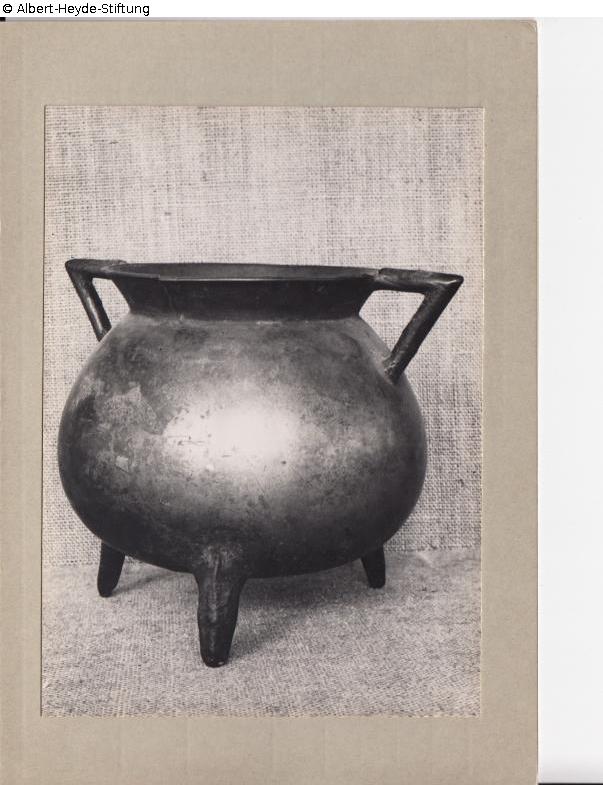 Grapen mit gedrückt kugelförmigem Körper auf drei Füßen, Trichterrand und spitzwinklige, randständige Henkel.