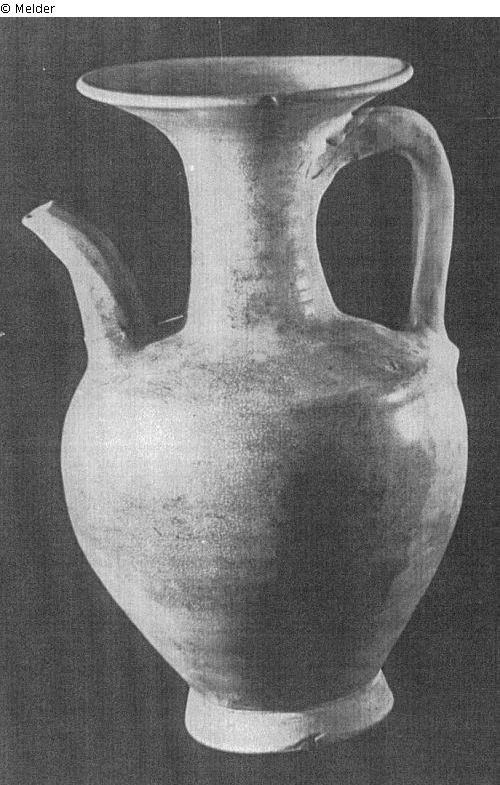Henkel und Tülle sind steil angesetzt. Graues Steinzeug mit weißer Engobe und cremefarbener, feingesprüngelter Glasur, die durch Lagern in der Erde bräunlich verfärbt ist. Tülle abgebrochen und geleimt. T´ing yao vom Chü-lu-hsien-Typus