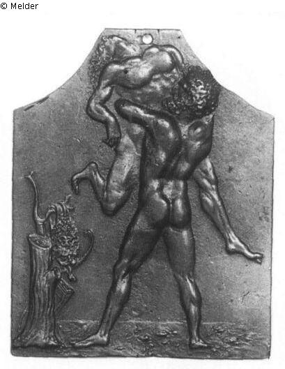 Rechteckige Plakette, die oberen Ecken sind bogenförmig weggeschnitten. Herkules steht in Rückenansicht und würgt den Antäus, den er in die Höhe gehoben hat. Links sieht man einen Baumstumpf mit einem Ast, daran hängen das Löwenfell, Bogen und Köcher. Als Vergleichsbeispiele werden das dem Pollajuolo zugeschriebene Fresko im Palazzo di Venezia in Rom und die antike Statue im Hof des Palazzo Pitti in Florenz genannt. Exemplare mit breitem Palmettenrand befinden sich in der Slg. Whitcombe-Greene des Britischen Museums in London und im Kunstgewerbemuseum Berlin. Das vorhergehende Stück (Nr. 111) gehört offenbar zu der gleichen Serie, ist aber sicher nicht von derselben Hand.