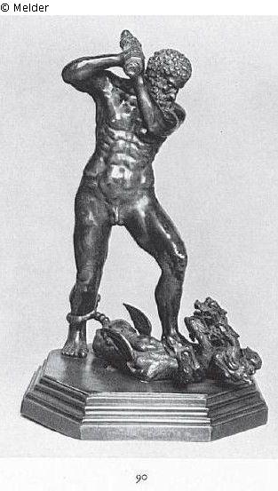 Im Kampfe mit dem vielköpfigen Drachen (im Garten der Hesperiden). Herkules, als bärtiger Mann, unbekleidet, hat den rechten Fuß auf den am Boden liegenden Drachen gesetzt. Mit beiden Händen hat er die Keule zum Schlage gegen ihn erhoben. Die Sockelplatte ist später hinzugefügt. Die Keule ist für sich gegossen und angeschraubt.
