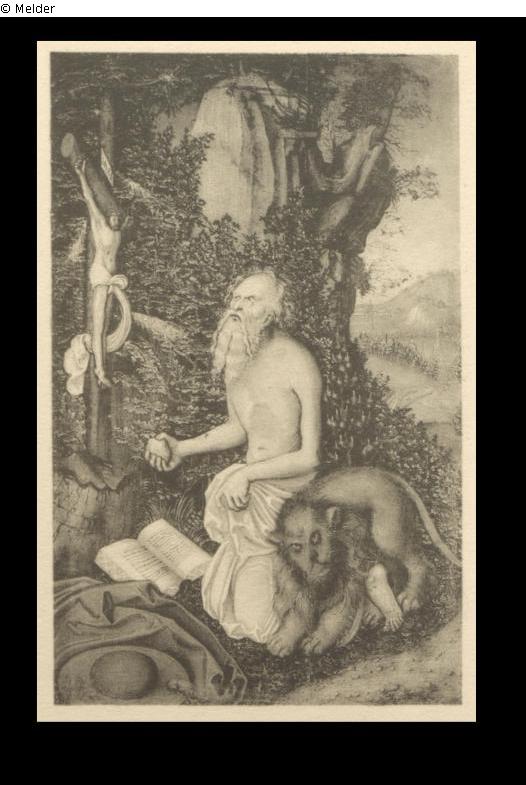Hl. Hieronymus mit Löwe vor Kruzifix und Felsen, roter Hut und Mantel am Boden.