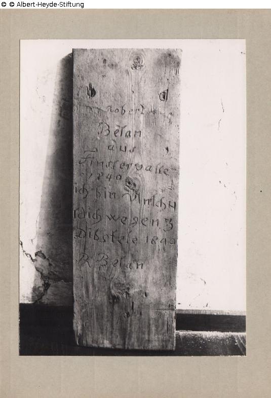 Balkeninschrift aus einer Gefängniszelle in Lübben: „Robert / Belan / aus / Finsterwalde / 1840 / ich bin Unschu / ldich wegen 3 / Dibstele 1840 / R. Belan“.