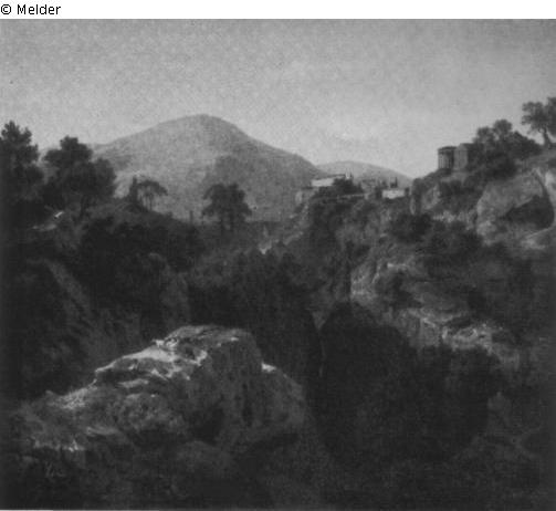 in der vorderen Bildmitte enge Schlucht zwischen steil hochgestiften, teilweise grün bewachsenen Felswänden links und rechts, auf der rechten Berghöhe antile Tempelanlage und Zitadelle, bez. r.: C H. Brandes