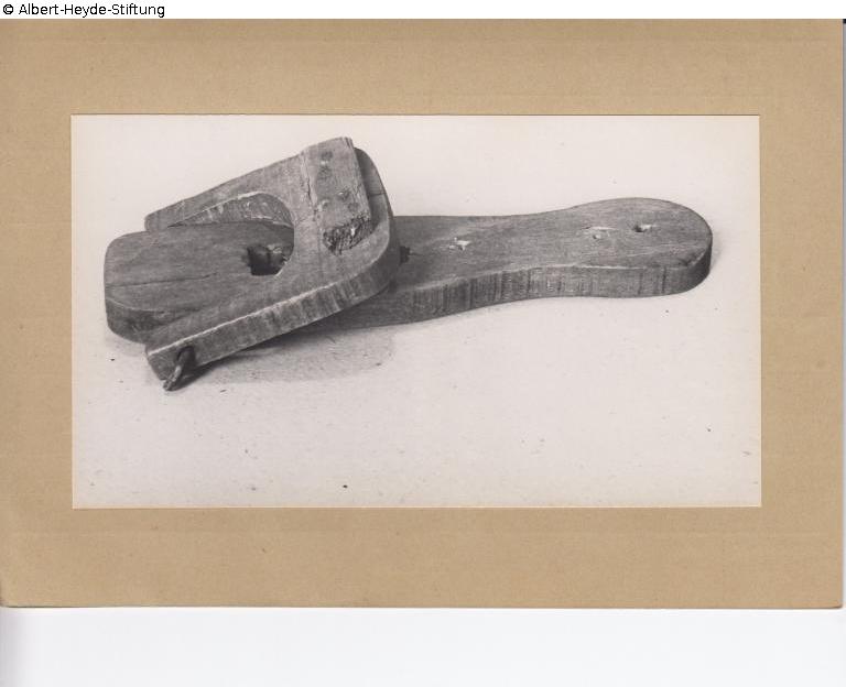 Schuhsohlenförmiges Eichenbrett, im vorderen Teil horizontal durchbohrt. Darin beweglich gelagert die Achse der hufeisenförmigen Klapper, die bei Hin- und Her-Bewegung auf das Eichenbrett schlägt.
