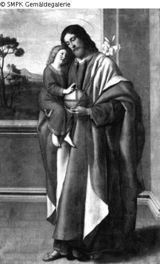 Tafelmalerei: Bild: der heilige Joseph als Nährvater Christi, er hält das Kind in seinen Armen oder führt es an der Hand; Pflegeeltern; Christuskind; Sohn; Vater; Vater und Sohn