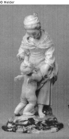 Das barfüßige Mädchen beugt sich stehend herab zu Kupido, der dicht vor ihr steht, den Kopf zurückneigt und die linke Hand nach ihr ausstreckt. Es berührt mit der linken Hand den gebeugten rechten Arm des kleinen Liebesgottes und streckt Zeigefinger und Daumen der rechten Hand aus, um Kupido zu belehren. Das Mädchen trägt ein verknotetes weißes Kopftuch, zartrosa und hellblau gestreiftes weißes Schultertuch, strohgelbes, vorn weißes und ockergelb feingestreiftes Mieder, weiße Hemdärmel, hochgerafften hellblauen Rock mit weißer Innenseite und rosa Unterrock. Der Steinsockel grauviolett, grünlich und braun, die Grasdecke grün mit violetter Strichelung. Blaue Radmarke. Amor leicht repariert.