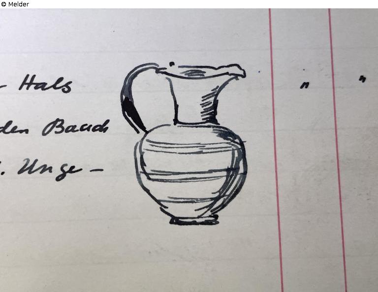 Kanne, schwarzer Ton, übereinstimmend mit T 3283: hoher Hals, Mündung vorne leicht eingedrückt, um den Bauch 3 Gruppen paralleler Linien, ungebrochen