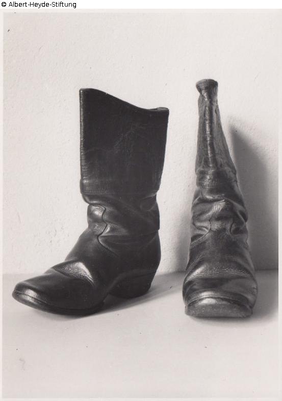 Paar stark abgelaufener, halbhoher Schaftstiefel mit Holz genagelten Sohlen.
