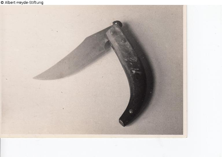 Messer mit geschweifter Klinge. Am Klingenrücken eingepunzte Halbkreise. Die Klinge ist über eine Achse in die Hornschäftung einklappbar.