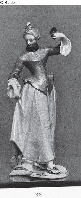 In schreitender Stellung, die rechte Hand am Rock, in der erhobenen Linken eine schwarze Maske, wendet sie den Kopf herausfordernd nach rechts. Sie trägt ein winziges grünes Hütchen mit bläulicher Feder, schwarze Halskrause, purpurn gerändertes, hellpurpurnes Mieder mit blauen Schleifen an den Aufschlägen, gelben Rock und blau geränderte weiße Schuhe mit blauen Schleifen und roten Absätzen. Der geschweifte weiße Sockel blau und golden gerändert. Linke Hand ergänzt. Marke: eingedrückter Rautenschild. Modell von Franz Anton Bustelli.
