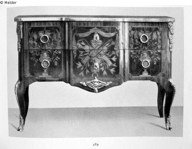 Rosen- und Palisanderholzfurnier, mit reichen Intarsien, auf drei Feldern der Vorderfront und an den Seiten Musikalienbündel und Blütenvasen, Urnen und Blütenfestons. Zwei Schubladen, vorgezogen Mittelrisalit, geschweifter Ablauf. Goldbronzebeschläge. Graue Marmorplatte.