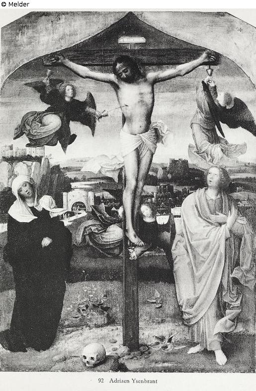 In der Mitte der Crucifixus. Rechts steht der zu Christus aufblickende Johannes in rotem Gewand und Mantel, links Maria in weißem Kopftuch und dunkelblauem Mantel. Über Johannes und Maria und um den Kreuzesstamm drei fliegende Engel in farbigen Gewändern, die das Blut Christi in Kelchen auffangen. Den Hintergrund bildet eine reiche Landschaft mit Stadt, Seen und Felsenburgen. Oben geschweift und die Ecken (später) vergoldet. Holzrahmen. rückseitig eingebrannter Besitzerstempel D. G. H. unter Krone. Besprochen und ganzseitig abgebildet bei Max J. Friedländer: Die altniederländische Malerei, elfter Band, S. 133, Abb. Tafel LXV, Nr. 158. Quelle: Hugo Helbing Kunsthandlung und Kunstversteigerungshaus: Kunstbesitz eines Berliner Sammlers. Katalog Nr. 49. (DOI: Externer Link)