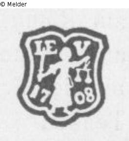 Zinnkrug der Fischer-Innung. Auf dem Deckel graviert zwei gekreuzte Fische, am Rumpfe bez.: Johann Christoph Weber. Ao. 1753. Gemarkt mit Dresdner Stadtmarke und einem Meisterzeichen.