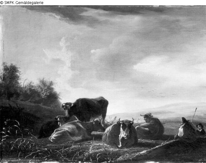 Tafelmalerei: Bild: Herde, Schafherde : Kuh & Wiese, Weideland; Vieh; Schaf : Kuh & Wiese; Gras; Signatur: Links unten: A. cuyp. A cuyp; Maße: 49 x 73 cm