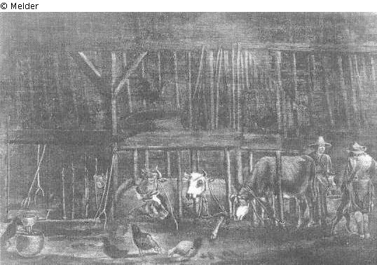 Stallinterieur mit zwei Bauern rechts; bildparallel die Front mehrgeschossiger senkrechter Streben, hinter denen mehrere Kühe stehen; im Vordergrund pickende Hühner; Signatur: B. v kalraet; Maße: 32,5 x 48,5 cm